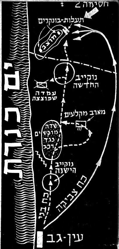 Sketch map of the action. 'Blocking force 2'. Trenches - bunkers. The army post. New Nukeib village. Position that was blown up. Machine gun ambush. Anti-vehicle minefield. Old Nukeib village. The routes taken by the forces Beni (dashes left) and Tzvika (solid curved) At the bottom – northern building of Ein Gev. |